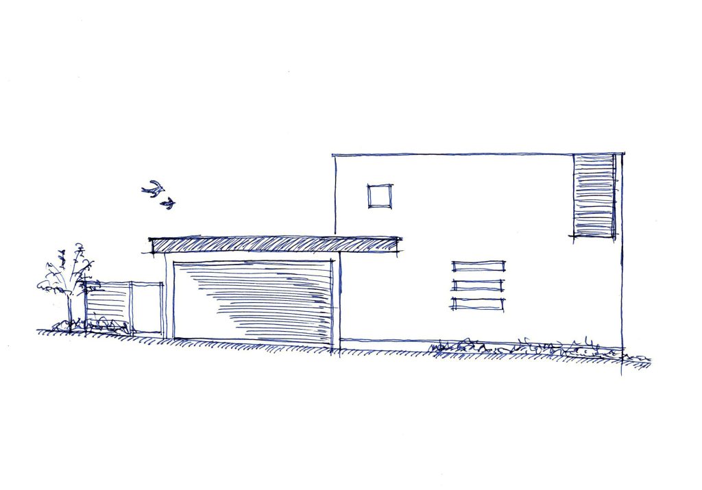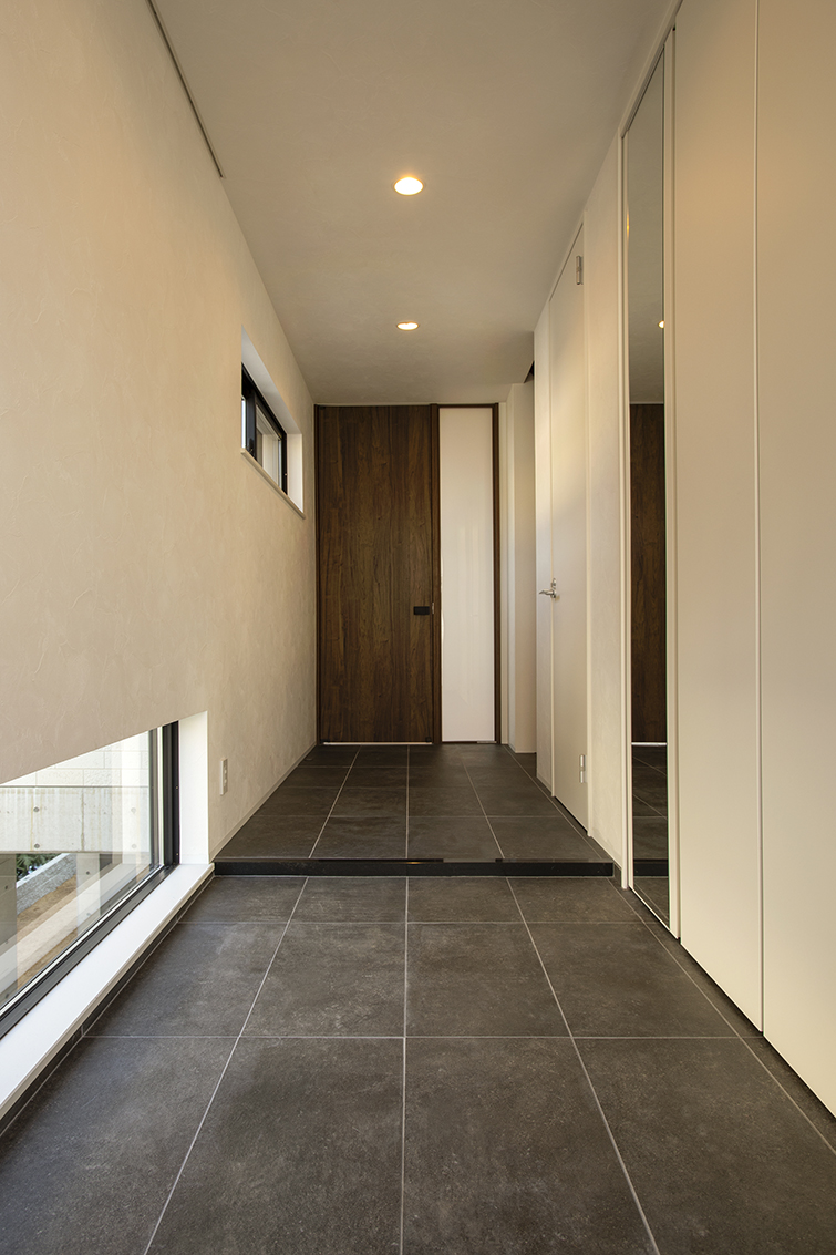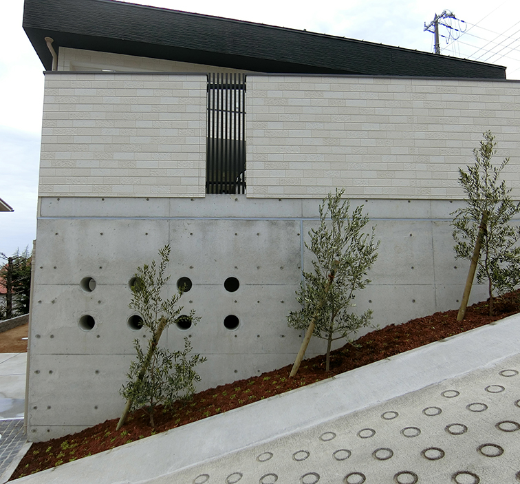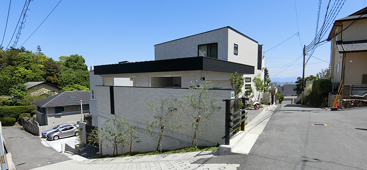 この土地は第1種低層住居専用地域内において日影規制・がけ条例・道路セットバックと多くの法的制限をクリアする必要があり加えて家相のこだわり、プライバシーを確保しながら如何に効率的な動線を構成するかプラン上、多くの工夫が必要であった。